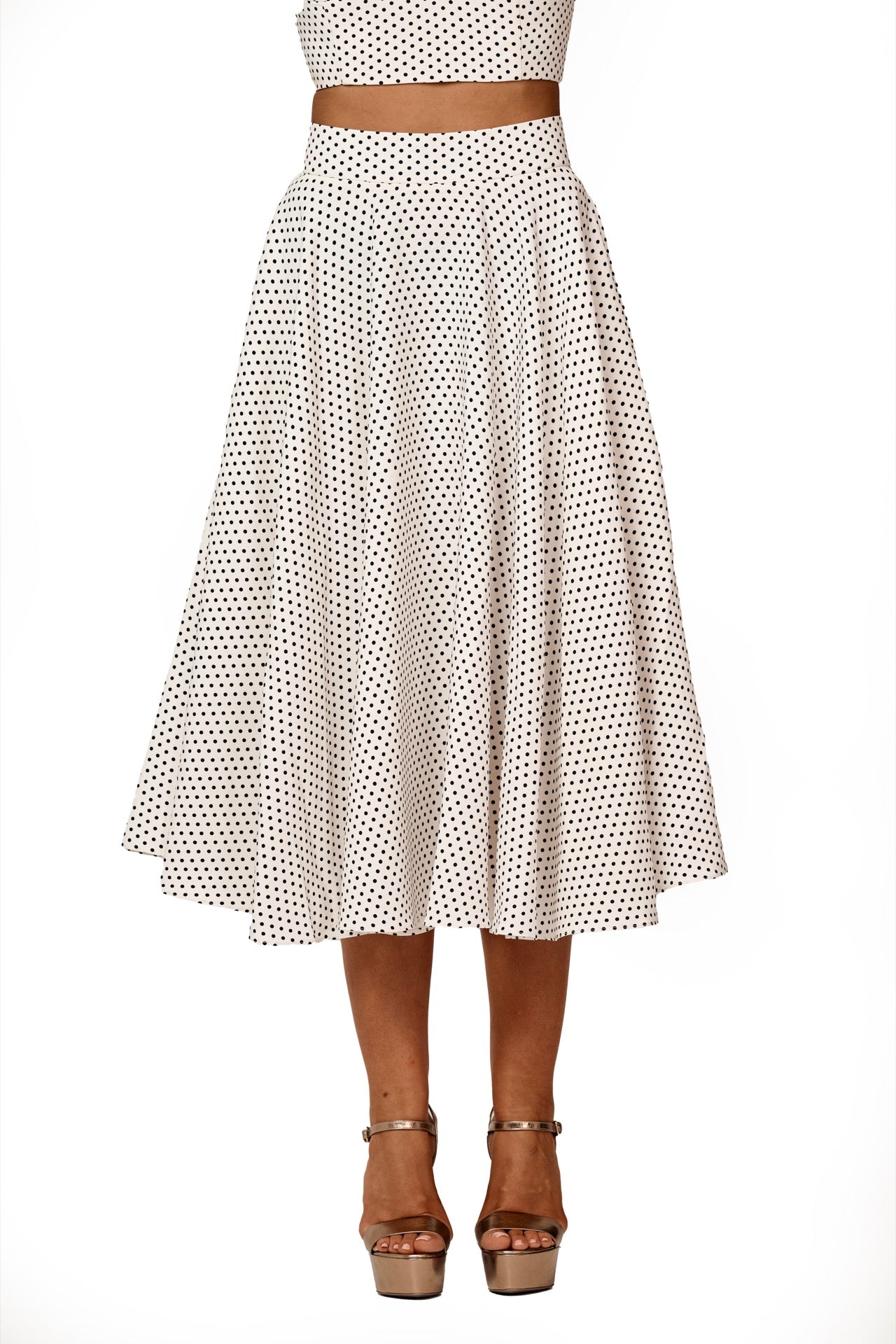 Fusta alba midi cu imprimeu polka dots negre, talie inalta si croiala ampla. O piesa feminina si eleganta, perfecta pentru tinute de zi sau evenimente speciale.