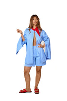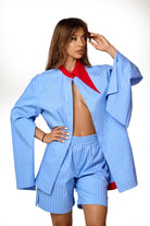 Pantaloni scurti albastri cu dungi fine si talie elastica, realizati intr-o croiala lejera si confortabila. Design modern si versatil, ideali pentru tinute casual chic sau pentru a fi purtati in set cu camasa asortata.