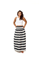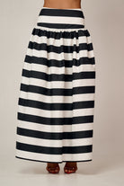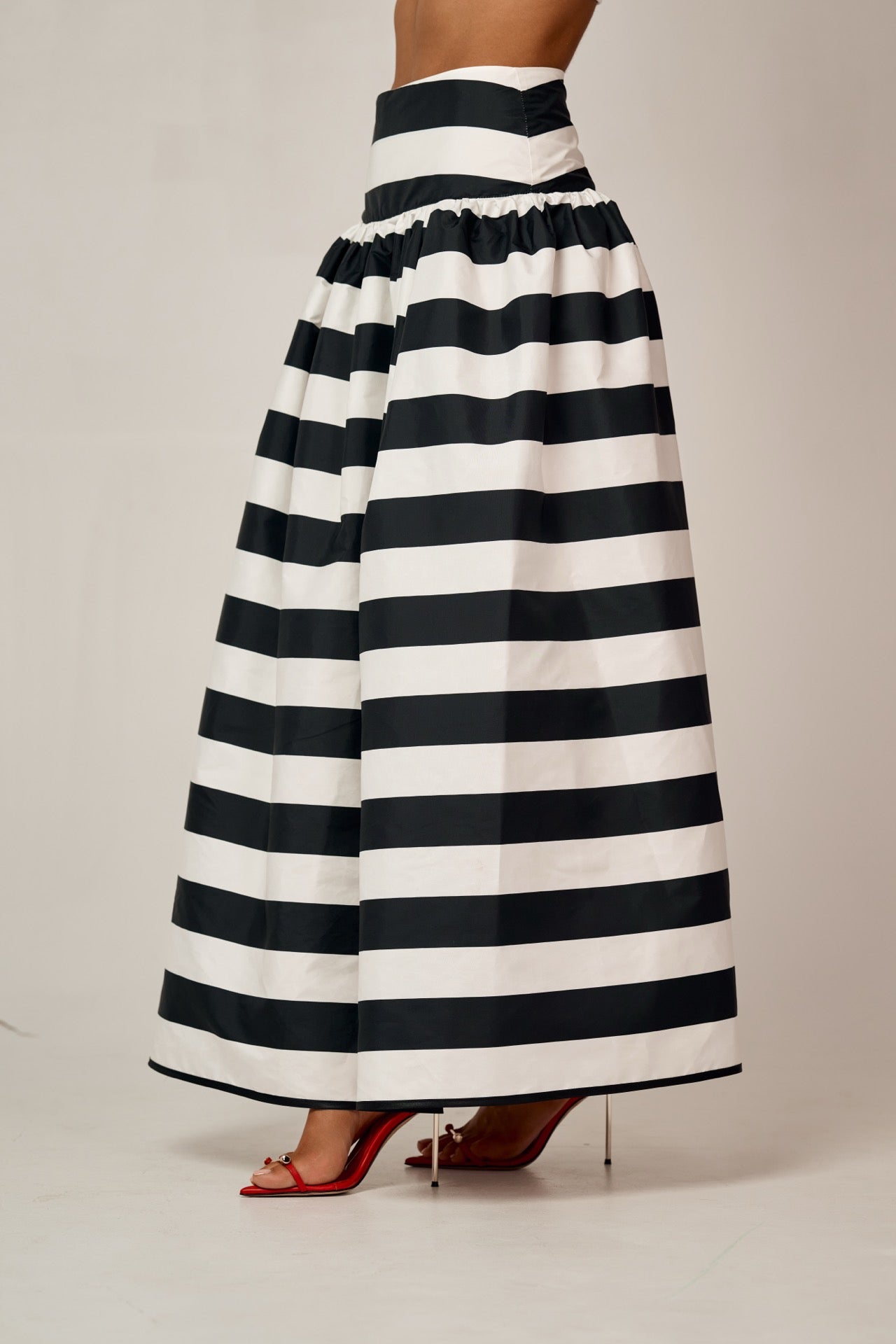 Fusta lunga cu dungi alb si bleumarin si talie inalta structurata. Volumul amplu si croiala ampla creeaza o silueta eleganta si sofisticata, in timp ce contrastul dungilor late adauga un efect statement si modern. Piesa rafinata, ideala pentru tinute elegante de seara sau aparitii spectaculoase.