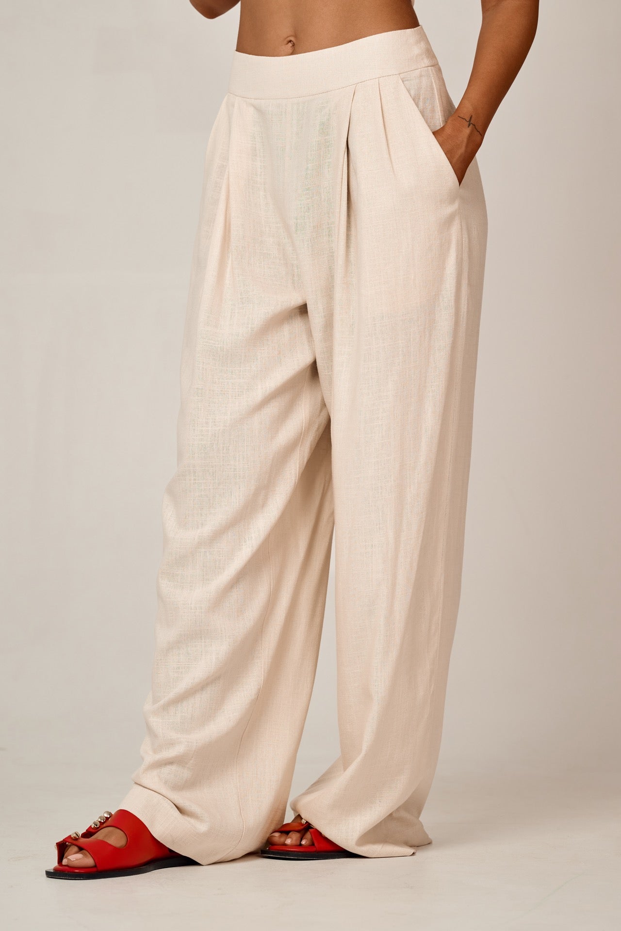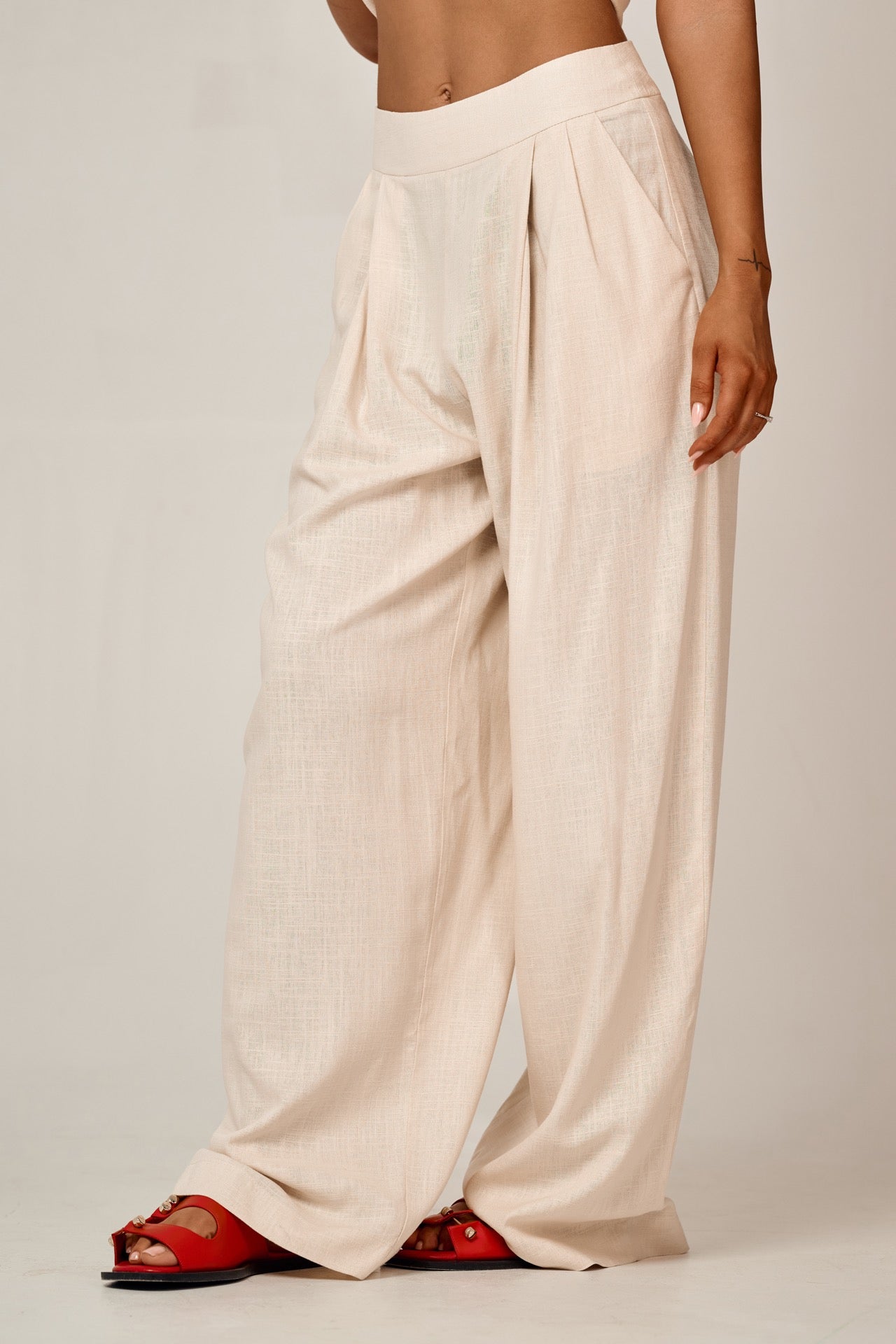Pantaloni din in in nuanta bej natur, cu croiala ampla, talie inalta si pense frontale. Un design relaxat si sofisticat, ideal pentru tinute elegante de zi.