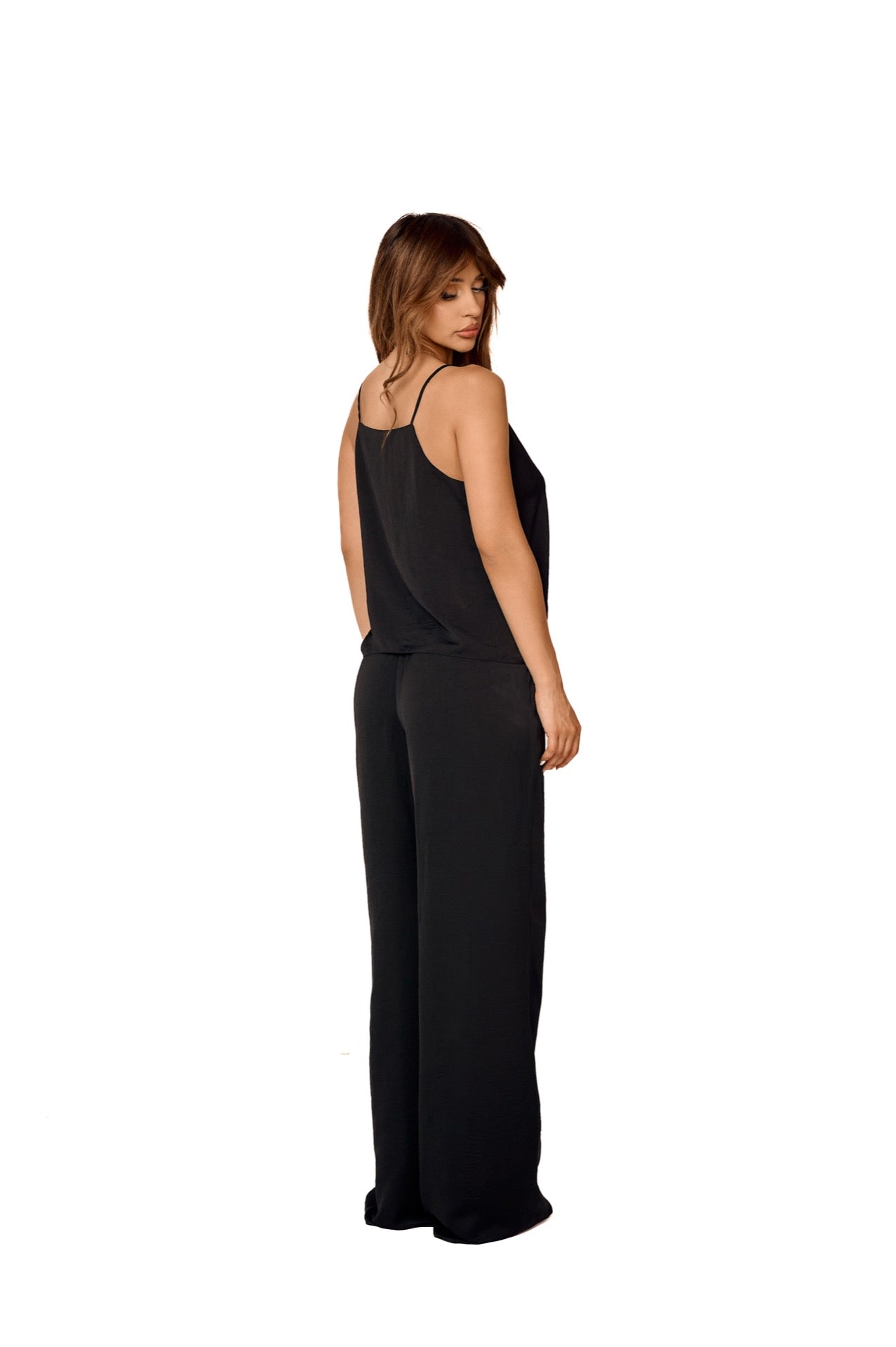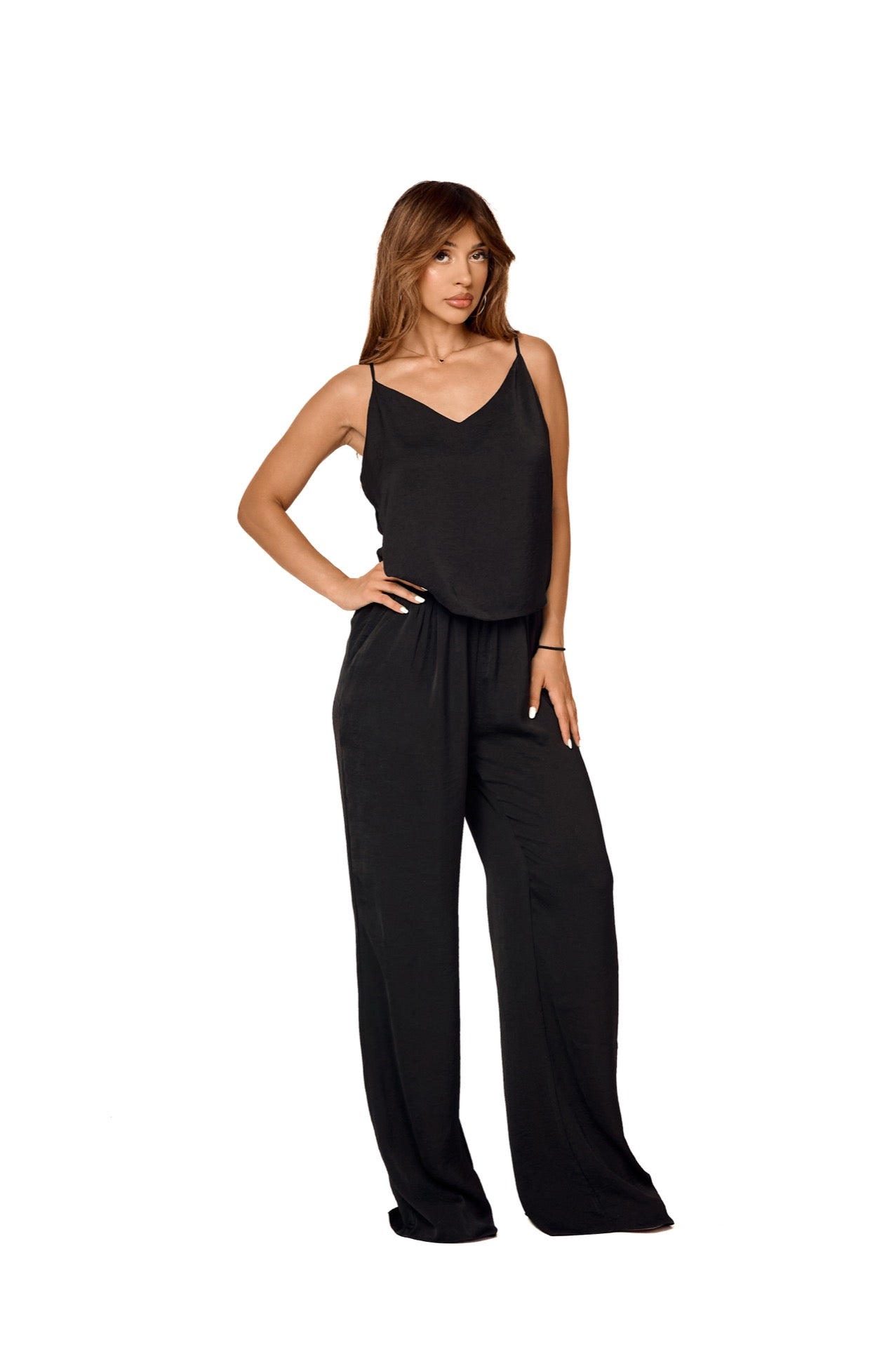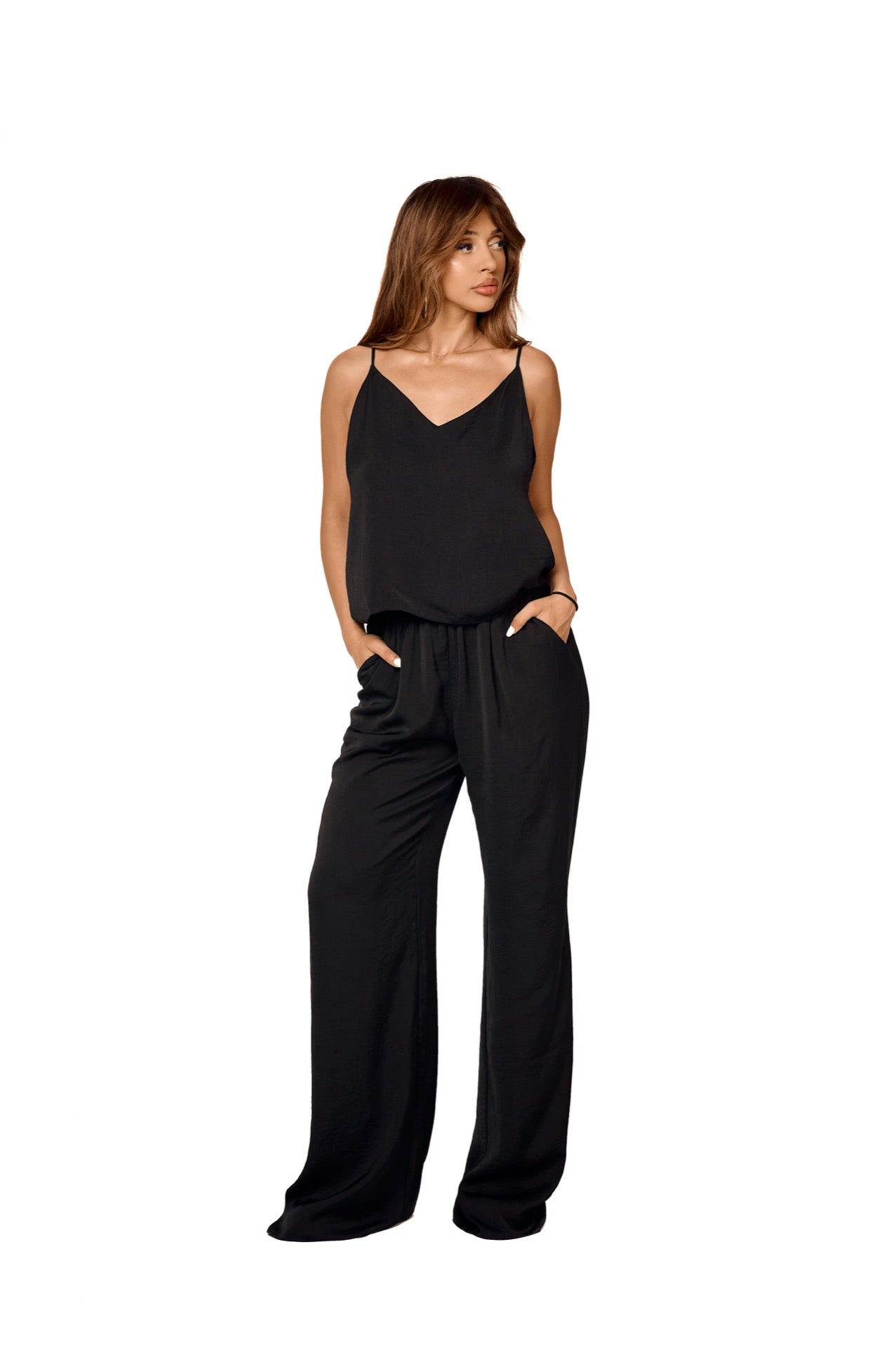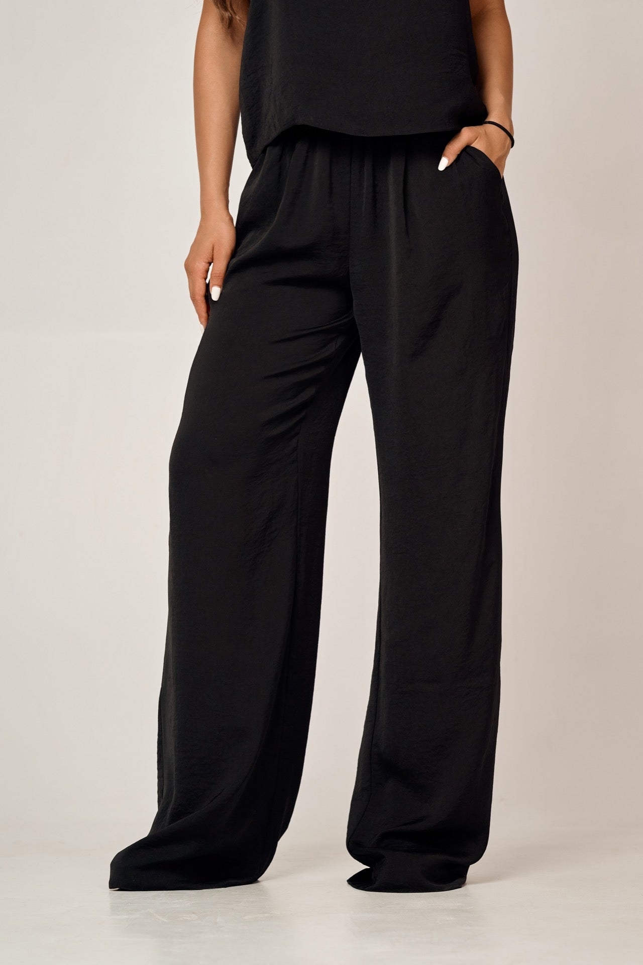 antaloni negri lejeri cu talie elastica, croiala ampla si design minimalist. Confortabili si eleganti, se potrivesc perfect atat in tinute casual, cat si in outfituri rafinate.