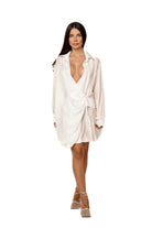 Rochie alba mini cu design tip camasa si detaliu drapat in zona taliei. Decolteul adanc si croiala fluida creeaza o silueta feminina si sofisticata, in timp ce gulerul clasic si manecile lungi adauga un echilibru elegant si modern. Piesa versatila, ideala pentru tinute elegante de zi sau aparitii rafinate de seara.