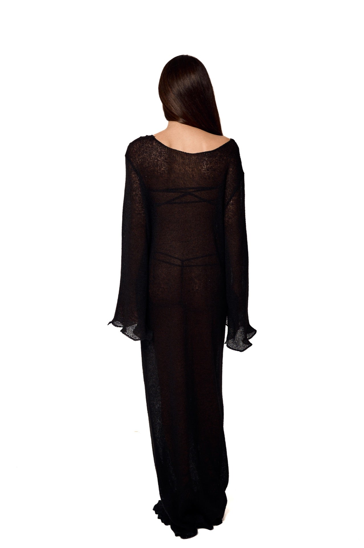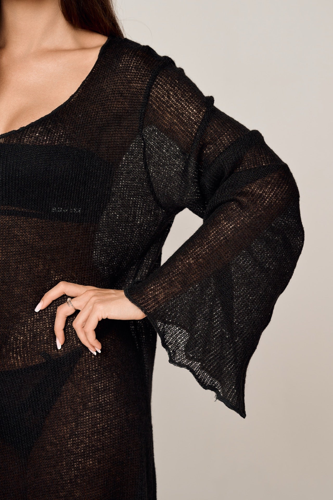 Rochie lunga neagra din material transparent, cu silueta fluida si design minimalist. Croiala lejera si manecile lungi cu terminatie delicata creeaza un look sofisticat si modern, in timp ce textura usoara adauga un efect subtil si elegant. Piesa versatila, ideala pentru layering sau tinute statement de seara.